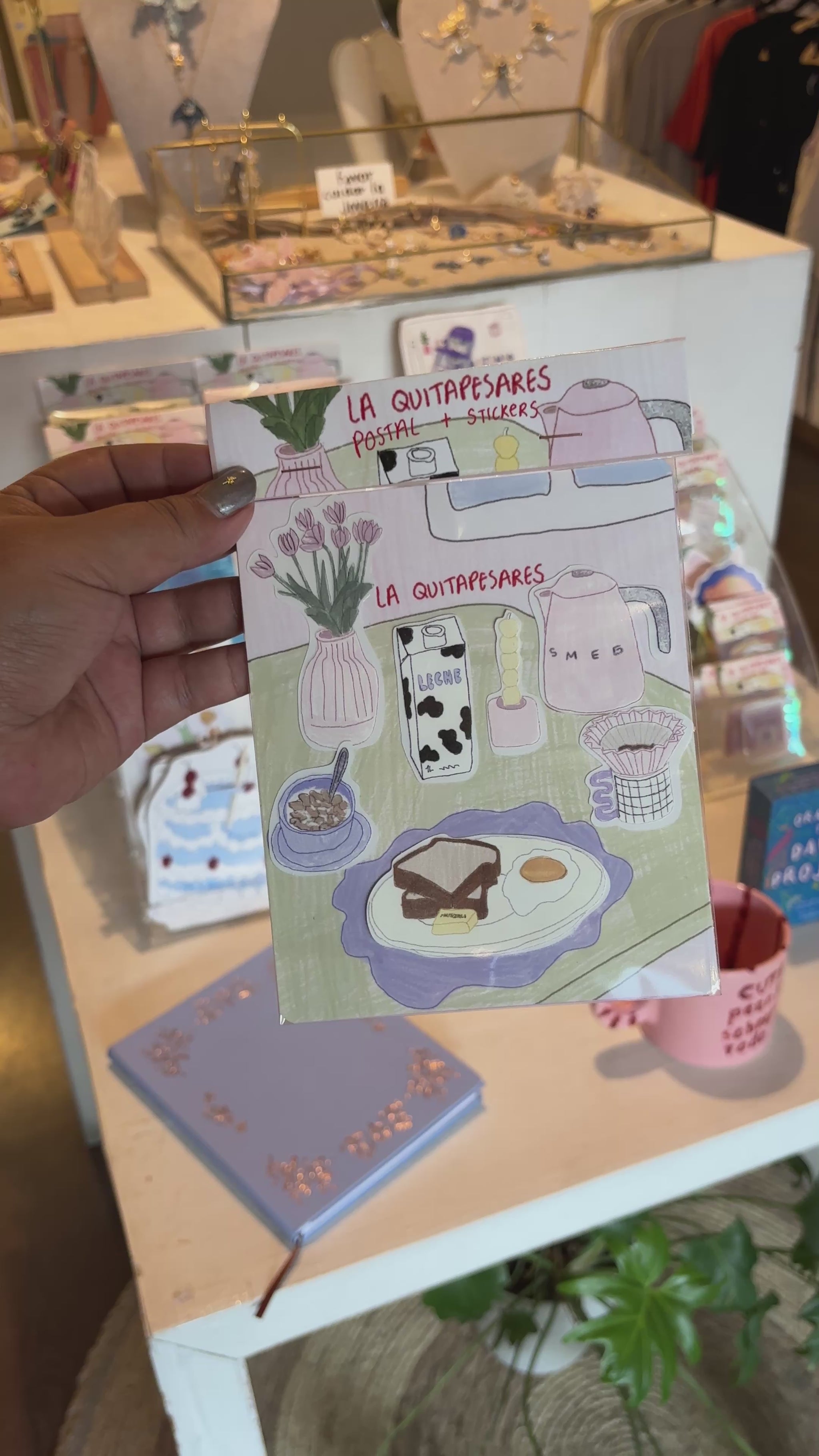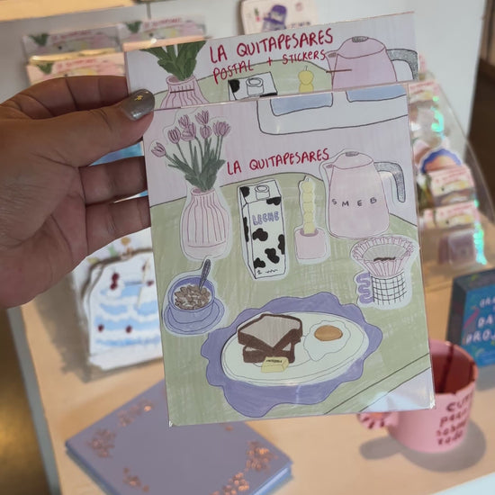 La Plantilla de stickers desayuno incluye un set de vinil transparente, resistente al agua, ideal para diversas aplicaciones decorativas. Al despegar los stickers, se obtiene una postal con la ilustración correspondiente, facilitando la personalización y el uso de los productos en diferentes contextos.